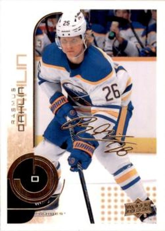 The Rasmus Dahlin 2022 Upper Deck MVP #82 20th Anniversary card is 1 of 24 Rasmus Dahlin's card variations in the 2022 Upper Deck MVP set being tracked by Sports Card Investor, including Base, Blue Script, Gold Script, Ice Battles, and Silver Script.