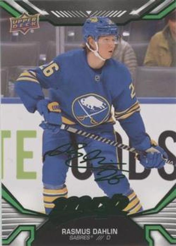 The Rasmus Dahlin 2022 Upper Deck MVP #14 Green Script card is 1 of 24 Rasmus Dahlin's card variations in the 2022 Upper Deck MVP set being tracked by Sports Card Investor, including Base, Blue Script, Gold Script, Ice Battles, and Silver Script.