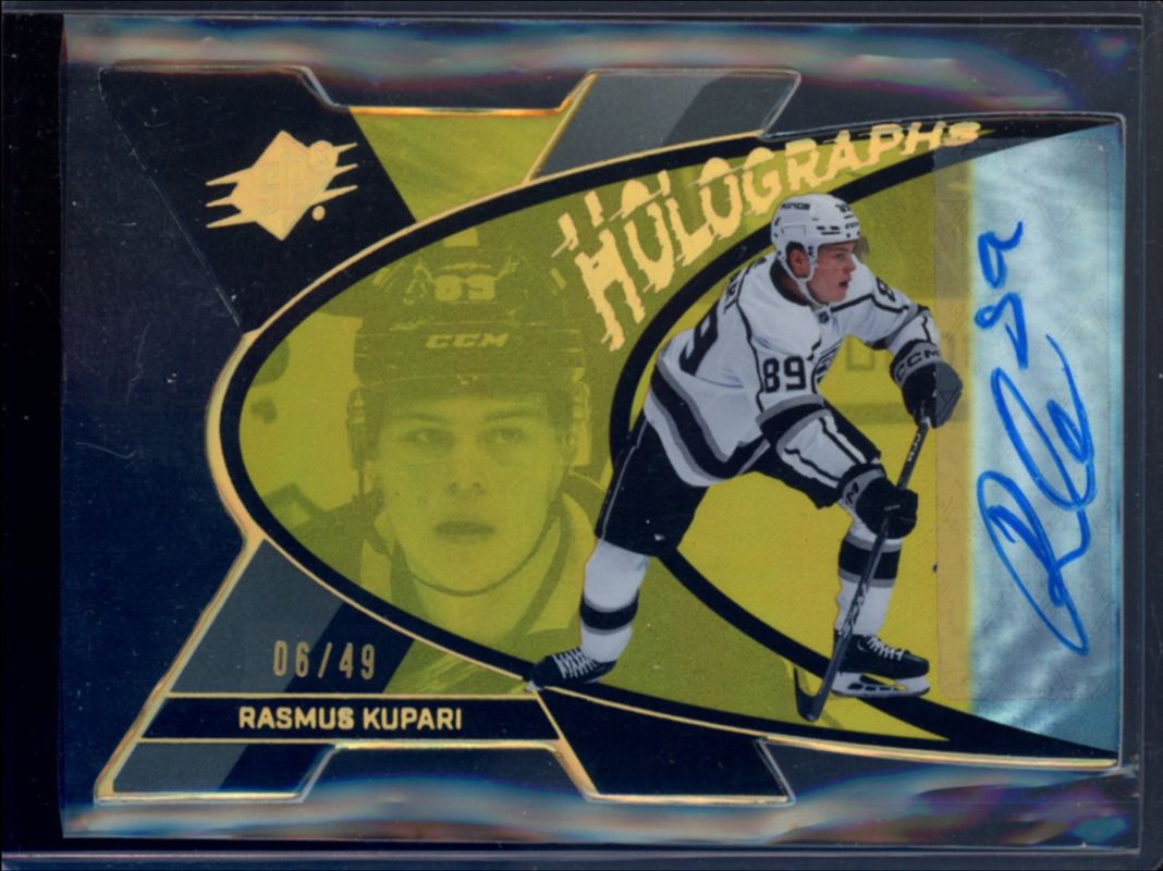 The Rasmus Kupari 2023 SPx #HG-RK Auto Holograph - Gold /15 card is 1 of 5 Rasmus Kupari's card variations in the 2023 SPx set being tracked by Sports Card Investor, including UD Black Pride of a Nation - Auto Patch /99, Auto Holograph /49, Auto Holograph - Red /25, and Auto Holograph - Blue /1.