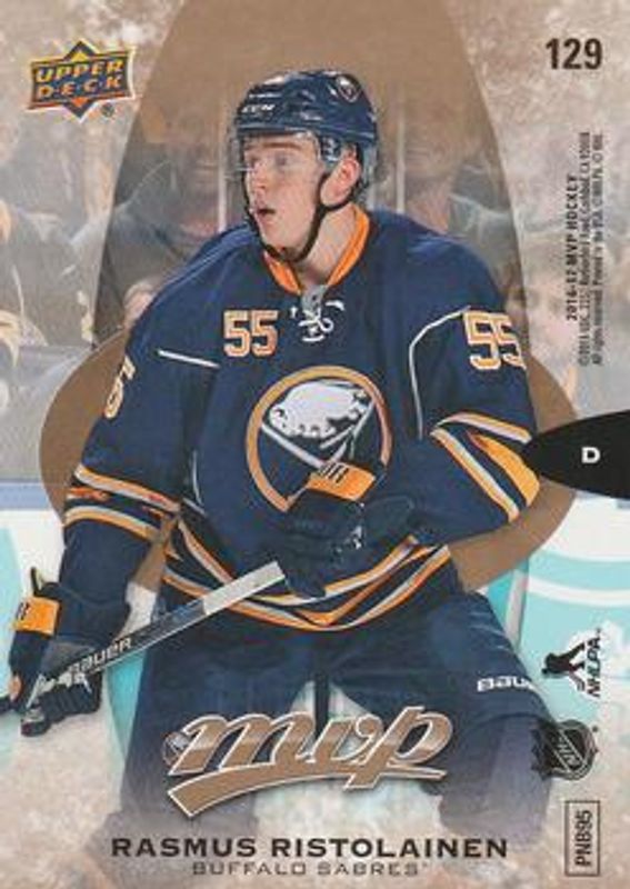The Rasmus Ristolainen 2016 Upper Deck MVP #129 Puzzle Back card is 1 of 11 Rasmus Ristolainen's card variations in the 2016 Upper Deck MVP set being tracked by Sports Card Investor, including Base, Colors & Contours, Green Script, Silver Script, and Gold Script /135.