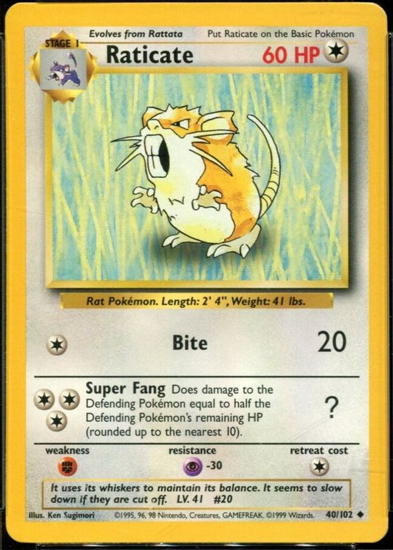 Raticate 40/102 - Uncommon 1999 English Base Set Pokemon Card - Near Mint & LP