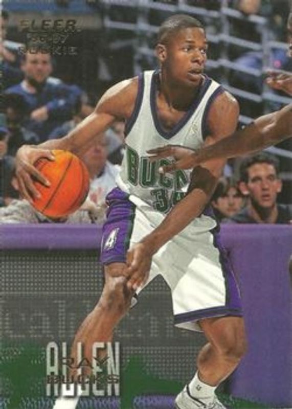 The Ray Allen 1996 Fleer #212 Base Rookie card is 1 of 4 Ray Allen's card variations in the 1996 Fleer set being tracked by Sports Card Investor, including Lucky 13, Rookie Sensations, and Swing Shift.