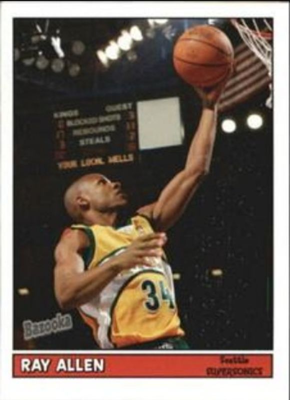 The Ray Allen 2005 Bazooka #89 Minis card is 1 of 7 Ray Allen's card variations in the 2005 Bazooka set being tracked by Sports Card Investor, including Base, Gold, Blue /5, All Star Relics, and Blog Squad Relics.