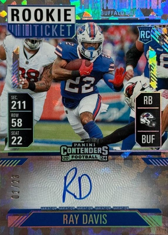 This card is 1 of 27 Ray Davis' card variations in the 2024 Contenders set being tracked by Sports Card Investor, including Rookie Ticket Auto, Rookie Ticket Auto - Opening Kickoff Ticket, Rookie Ticket Auto - Red Zone Ticket, Rookie Ticket Auto - Ticket Stub (/22), and Rookie Ticket Auto Variation.