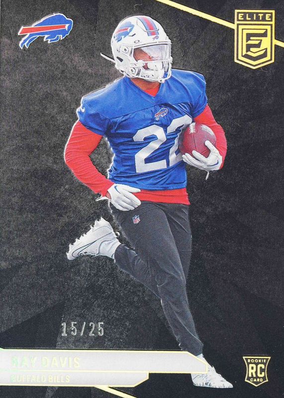 This card is 1 of 34 Ray Davis' card variations in the 2024 Elite set being tracked by Sports Card Investor, including Base Rookie /999, Aspirations (/78), Green Disco, Pink, and Status (/22).