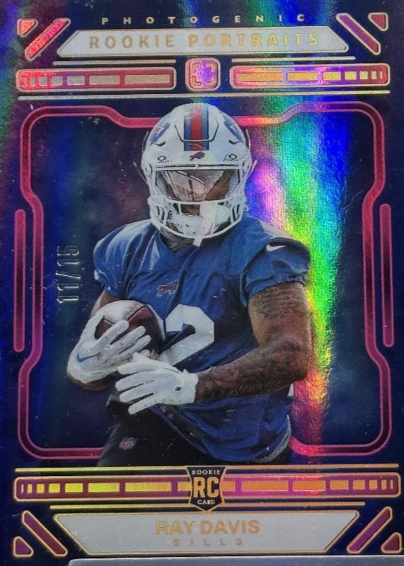 This card is 1 of 9 Ray Davis' card variations in the 2024 Photogenic set being tracked by Sports Card Investor, including Rookie Portraits, Rookie Portraits - Silver /150, Rookie Portraits - Blue /99, Rookie Portraits - Purple /75, and Rookie Portraits - Red /49.