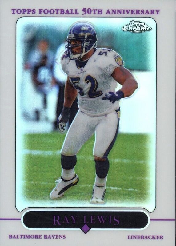 This card is 1 of 3 Ray Lewis' card variations in the 2005 Topps Chrome set being tracked by Sports Card Investor, including Gold X-Fractor /399, and Black Refractor /100.