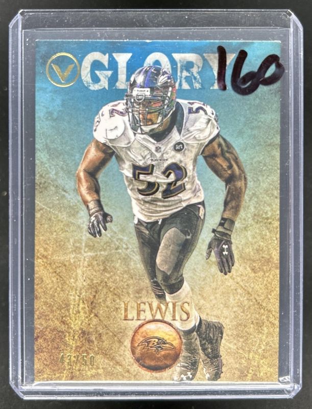 The Ray Lewis 2012 Topps Valor #1 Glory /50 card is 1 of 3 Ray Lewis' card variations in the 2012 Topps Valor set being tracked by Sports Card Investor, including Base /170, and Valor /1.