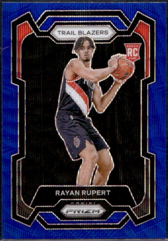 The Rayan Rupert 2023 Prizm #140 Blue Wave Rookie card is 1 of 95 Rayan Rupert's card variations in the 2023 Prizm set being tracked by Sports Card Investor, including Base, Choice Blue Yellow Green, Fast Break, Green, and Green Ice.
