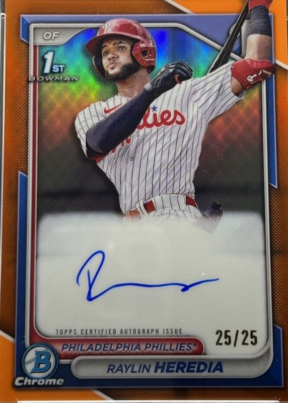 The Raylin Heredia 2024 Bowman #CPA-RH Chrome Prospect Auto - Orange Refractor /25 (1st) card in Raw condition has not changed in price in the last 30 days and was last sold for $27.00 .