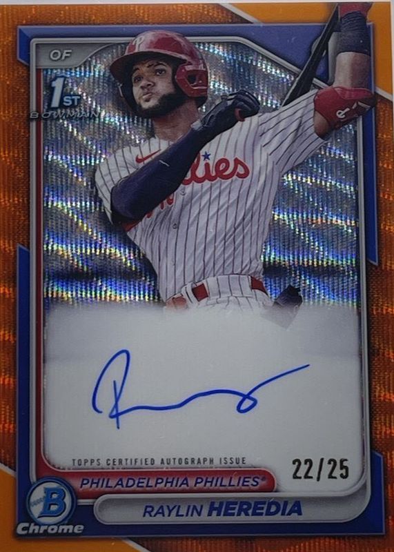 The Raylin Heredia 2024 Bowman #CPA-RH Chrome Prospect Auto - Orange Wave Refractor /25 (1st) card in Raw condition has not changed in price in the last 30 days and was last sold for $101.00 .