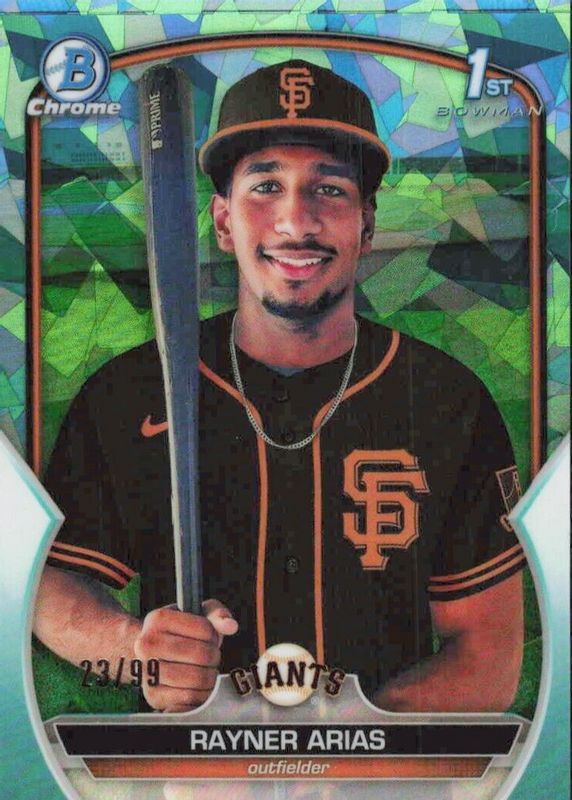 This card is 1 of 7 Rayner Arias' card variations in the 2023 Bowman Chrome Sapphire Edition set being tracked by Sports Card Investor, including Prospects (1st), Prospects - Orange /75 (1st), Prospects - Yellow /50 (1st), Prospects - Purple /25 (1st), and Prospects - Red /5 (1st).