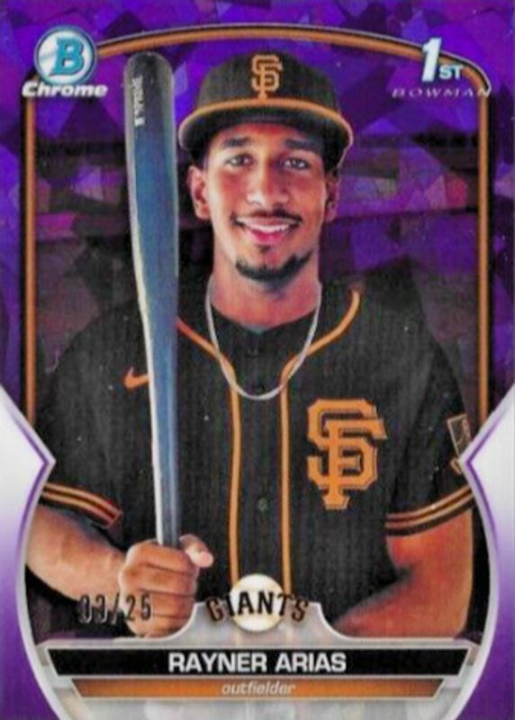 The Rayner Arias 2023 Bowman Chrome Sapphire Edition #BCP-222 Prospects - Purple /25 (1st) card in Raw condition has not changed in price in the last 30 days and was last sold for $54.00 .