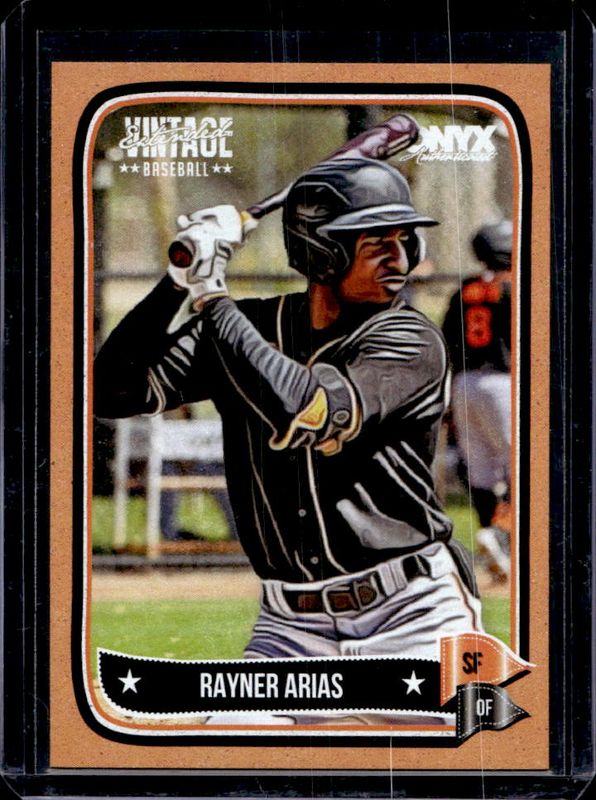 The Rayner Arias 2024 Onyx Vintage Extended Series #OVRAAR Orange /75 card is 1 of 22 Rayner Arias' card variations in the 2024 Onyx Vintage Extended Series set being tracked by Sports Card Investor, including Base, Nero, Yellow /150, Aqua /99, and Green /50.