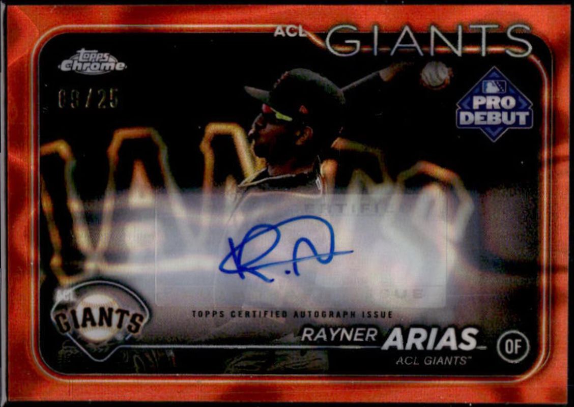 The Rayner Arias 2024 Topps Pro Debut #PDC-78 Chrome Autographs - Orange Lava Refractor /25 card is 1 of 43 Rayner Arias' card variations in the 2024 Topps Pro Debut set being tracked by Sports Card Investor, including Base, Fuchsia Foil /199, Sparkle Foil /175, Blue Foil /150, and Green Foil /99.
