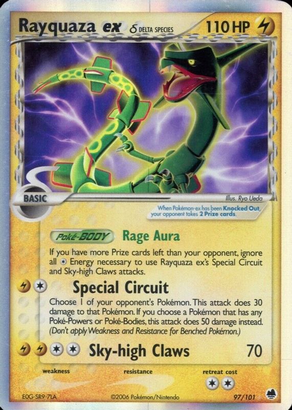 The Rayquaza ex 2006 EX: Dragon Frontiers #097/101 Holo card in Raw TCG (Near Mint) condition has not changed in price in the last 30 days and was last sold for $155.00 .