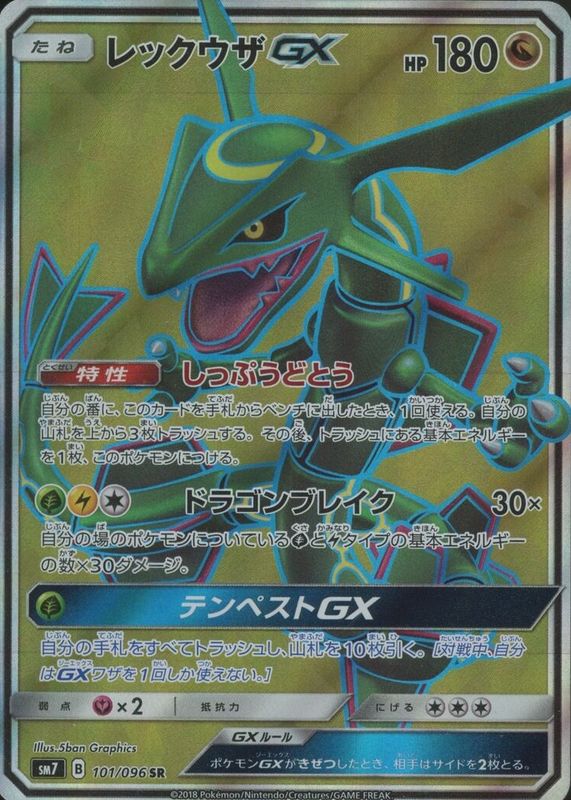 The Rayquaza GX 2018 Japanese Sun & Moon: Sky-Splitting Charisma #101/096 Super Rare card in Raw TCG (Near Mint) condition has not changed in price in the last 30 days and was last sold for $24.00 .