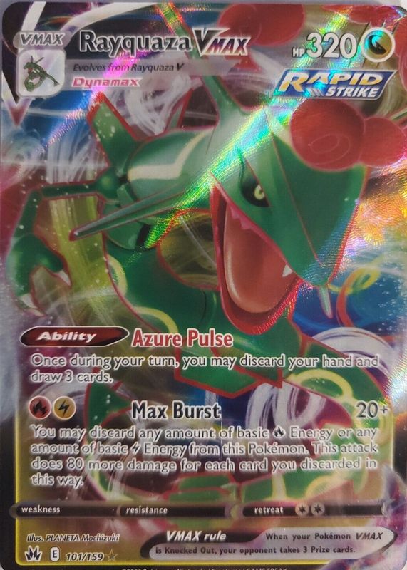 The Rayquaza VMAX 2023 Sword & Shield: Crown Zenith #101/159 Holo card in Raw TCG (Near Mint) condition has moved up $5.98 (+199%) in the last 30 days and was last sold for $8.98 .