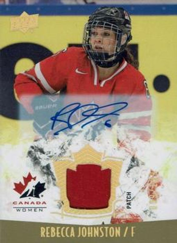 The Rebecca Johnston 2015 Upper Deck Team Canada Juniors #147 Gold Spectrum Autographs Patch /125 card is 1 of 18 Rebecca Johnston's card variations in the 2015 Upper Deck Team Canada Juniors set being tracked by Sports Card Investor, including Base, Gold, Exclusives /199, High Gloss /25, and Printing Plates Black /1.