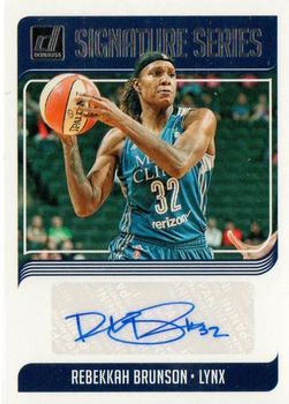 The Rebekkah Brunson 2019 Donruss WNBA #SS-RBS Signatures Series card is 1 of 19 Rebekkah Brunson's card variations in the 2019 Donruss WNBA set being tracked by Sports Card Investor, including Base, Optic, Optic Holo, Silver Press Proof /199, and Purple Press Proof /99.