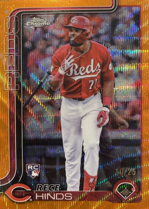The Rece Hinds 2025 Topps Chrome #253 Orange Wave Refractor /25 Rookie card in Raw condition has not changed in price in the last 30 days and was last sold for $15.51 .