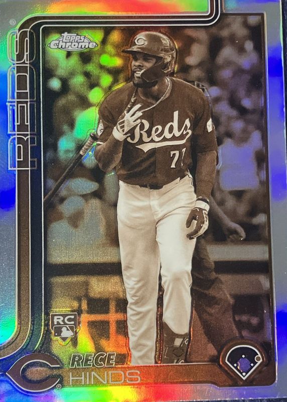 The Rece Hinds 2025 Topps Chrome #253 Sepia Refractor Rookie card in Raw condition has moved down -$0.99 (-49.7%) in the last 30 days and was last sold for $1.00 .