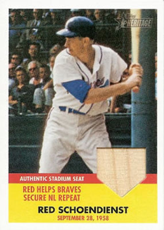 The Red Schoendienst 2007 Topps Heritage #FBR-RS Flashbacks Seat Relics card is 1 of 6 Red Schoendienst's card variations in the 2007 Topps Heritage set being tracked by Sports Card Investor, including Flashbacks, Flashbacks Autographs, Flashbacks Seat Relics Autographs, Real One Autographs, and Real One Autographs - Red Ink /58.
