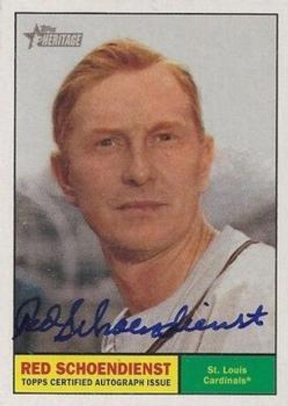 The Red Schoendienst 2010 Topps Heritage #ROARSC Real One Autographs card is 1 of 4 Red Schoendienst's card variations in the 2010 Topps Heritage set being tracked by Sports Card Investor, including #ROARS3 Real One Autographs - Red Ink /61, #ROA-RSC Real One Autographs - Red Ink /61, and #RS Baseball Flashback Autographs /25.