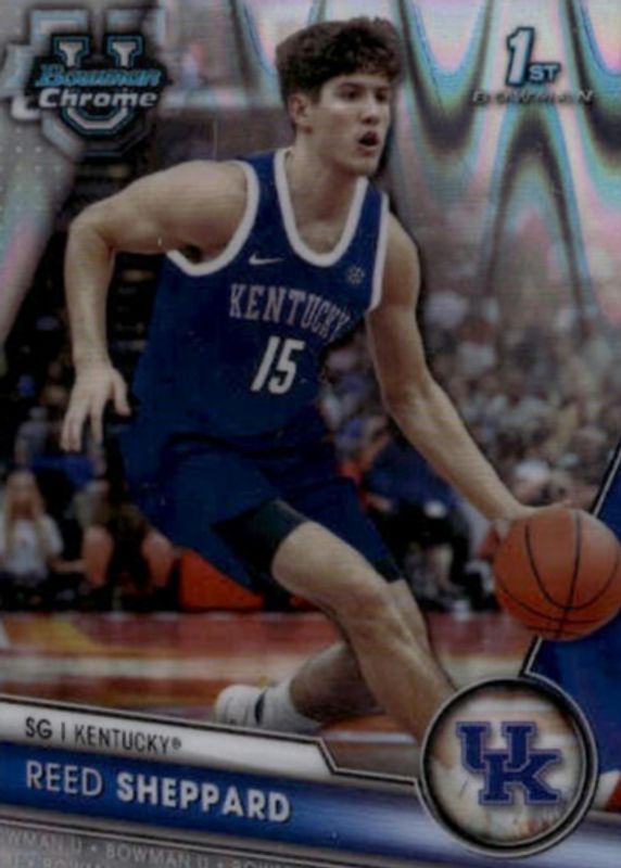 The Reed Sheppard 2023 Bowman Chrome University #45 RayWave Refractor /100 (1st) card in Raw condition has not changed in price in the last 30 days and was last sold for $15.50 .