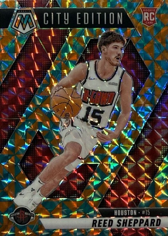This card is 1 of 204 Reed Sheppard's card variations in the 2024 Mosaic set being tracked by Sports Card Investor, including Base, City Edition, NBA Debut, Choice Red & Green, and City Edition - Choice Red & Green.
