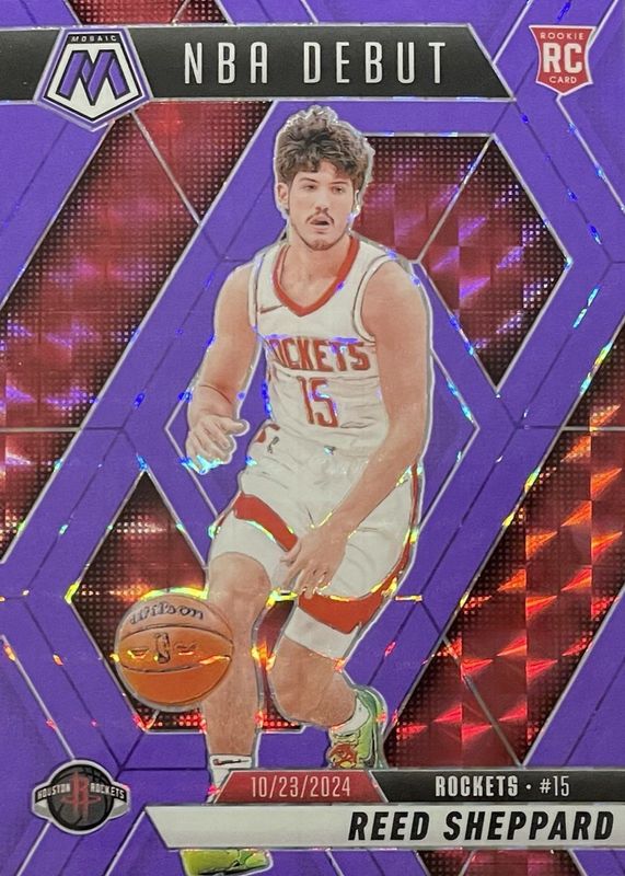 2024-25 Mosaic Reed Sheppard RC Purple Fluorescent NBA Debut #15/249 Rockets