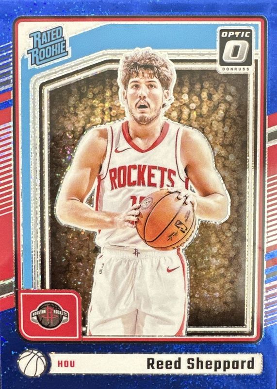 The Reed Sheppard 2024 Optic #255 Blue Glitter /15 Rookie card in Raw condition has not changed in price in the last 30 days and was last sold for $100.00 .