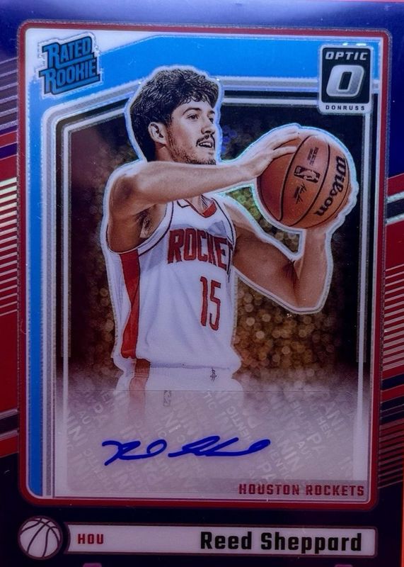 The Reed Sheppard 2024 Optic #302 Rated Rookie Signatures - Purple card in Raw condition has not changed in price in the last 30 days and was last sold for $39.99 .