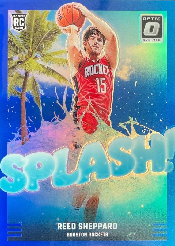 The Reed Sheppard 2024 Optic #13 Splash! - Blue /85 Rookie card in Raw condition has not changed in price in the last 30 days and was last sold for $8.50 .
