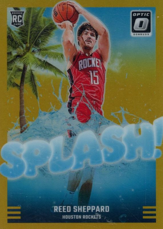 The Reed Sheppard 2024 Optic #13 Splash! - Gold /10 Rookie card in Raw condition has not changed in price in the last 30 days and was last sold for $230.00 .
