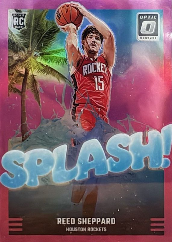 The Reed Sheppard 2024 Optic #13 Splash! - Pink /25 Rookie card in Raw condition has not changed in price in the last 30 days and was last sold for $30.00 .