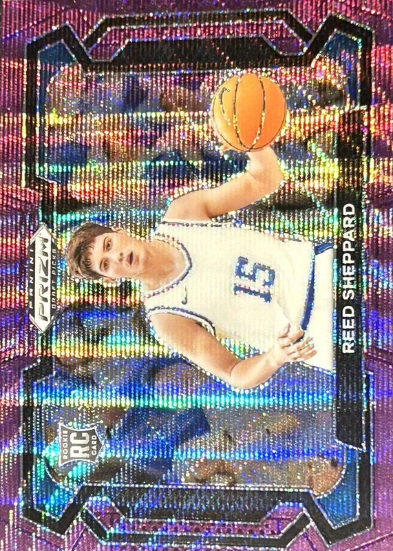 The Reed Sheppard 2024 Prizm Draft Picks #21 Variation - Purple Wave Rookie card in Raw condition has not changed in price in the last 30 days and was last sold for $1.50 .