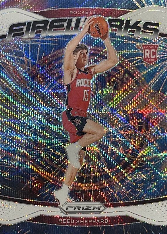The Reed Sheppard 2024 Prizm #15 Fireworks - White Wave /20 Rookie card in Raw condition has not changed in price in the last 30 days and was last sold for $42.75 .
