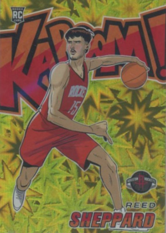 The Reed Sheppard 2024 Revolution #18 Kaboom! (Vertical) - Gold /10 Rookie card in Raw condition has not changed in price in the last 30 days and was last sold for $5,200.00 .