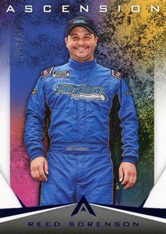 The Reed Sorenson 2020 Chronicles NASCAR #5 Ascension Blue /199 card is 1 of 10 Reed Sorenson's card variations in the 2020 Chronicles NASCAR set being tracked by Sports Card Investor, including Ascension, Ascension Autographs /199, Ascension Red /99, Ascension Autographs Purple /25, and Ascension Purple /25.