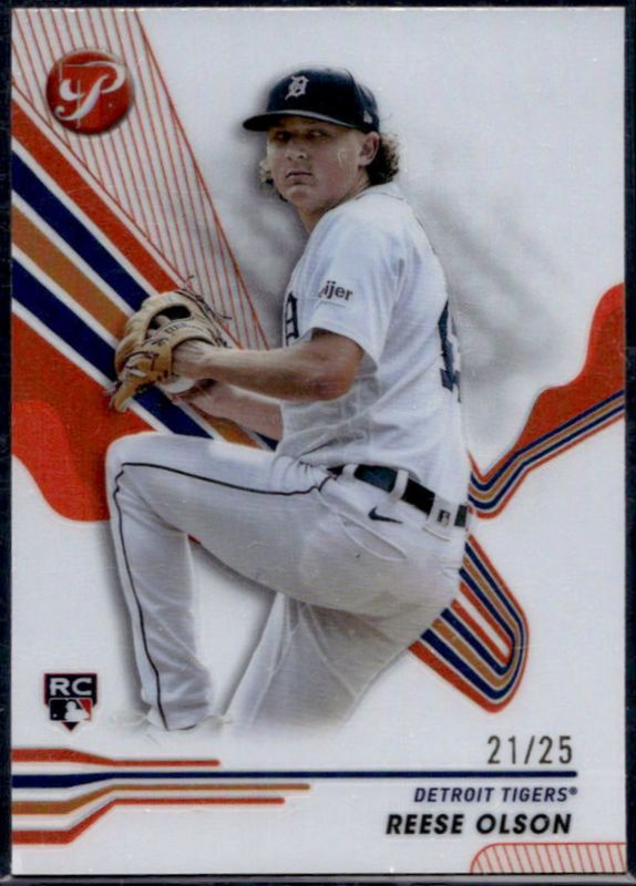 The Reese Olson 2024 Topps Pristine #16 Orange Refractor /25 Rookie card is 1 of 26 Reese Olson's card variations in the 2024 Topps Pristine set being tracked by Sports Card Investor, including Base, Pristine Refractor, Refractor, Green Refractor /150, and Pristine Purple Refractor /99.