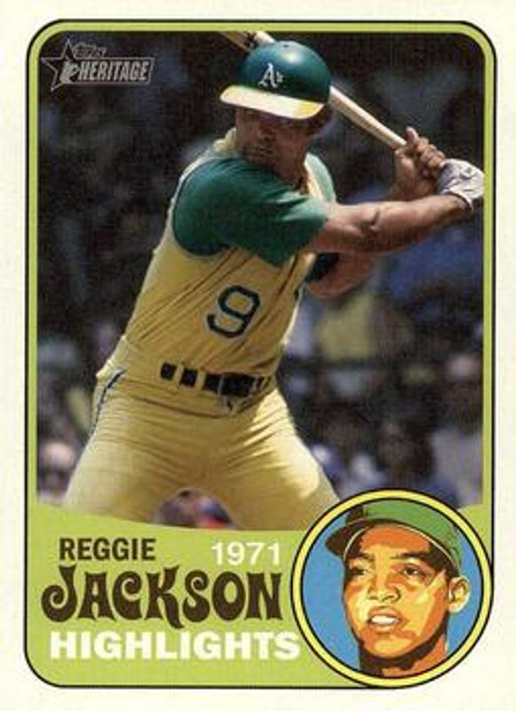 The Reggie Jackson 2018 Topps Heritage #RJH-2 Reggie Jackson Highlights card is 1 of 28 Reggie Jackson's card variations in the 2018 Topps Heritage set being tracked by Sports Card Investor, including 1969 Topps Bazooka All Time Greats, 1969 Topps Decals High Number, 50th Anniversary Buybacks, Baseball Flashbacks, and Real One Autographs.