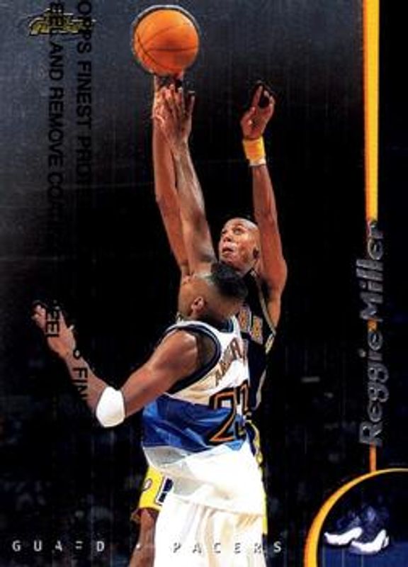The Reggie Miller 1998 Topps Finest #56 Base card is 1 of 5 Reggie Miller's card variations in the 1998 Topps Finest set being tracked by Sports Card Investor, including Base - No Coating, Refractor, Refractor - No Coating, and Promos.