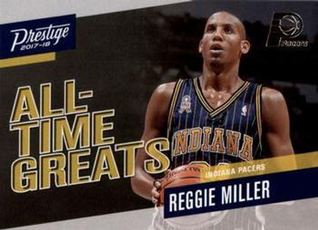 The Reggie Miller 2017 Prestige #19 All Time Greats card is 1 of 10 Reggie Miller's card variations in the 2017 Prestige set being tracked by Sports Card Investor, including All Time Greats - Crystal, All Time Greats - Horizon, All Time Greats - Mist, All Time Greats - Rain, and Prestigious Signatures.