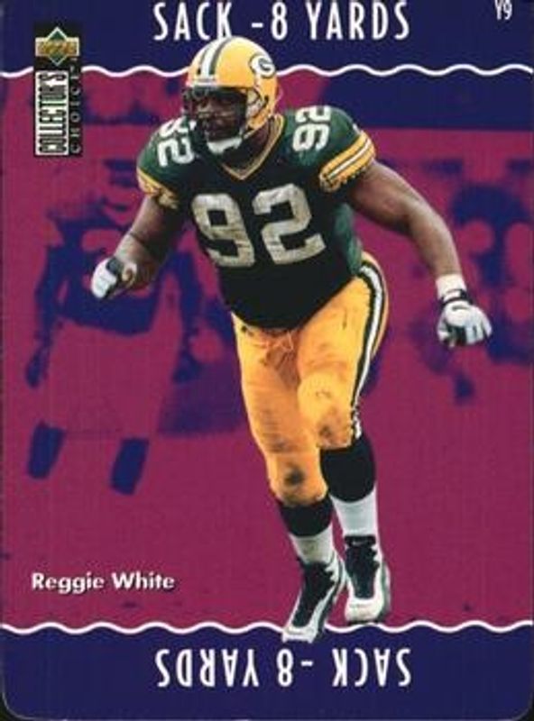 The Reggie White 1996 Upper Deck Collector's Choice Update #Y9 You Make The Play card is 1 of 4 Reggie White's card variations in the 1996 Upper Deck Collector's Choice Update set being tracked by Sports Card Investor, including Play Action Stick Ums, Play Action Stick Ums Mystery Bases, and You Make The Play.