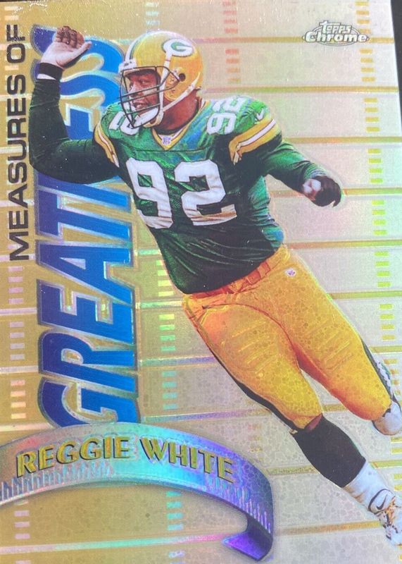 The Reggie White 1998 Topps Chrome #MG8 Measures of Greatness - Refractor card in Raw condition has moved up $8.23 (+93.8%) in the last 30 days and was last sold for $17.00 .
