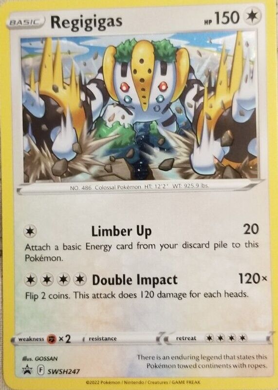 The Regigigas 2022 Sword & Shield: Black Star Promo #SWSH247 Single Pack Blisters (Lost Origin) card in Raw TCG (Near Mint) condition has moved up $0.10 (+3.7%) in the last 30 days and was last sold for $2.79 .