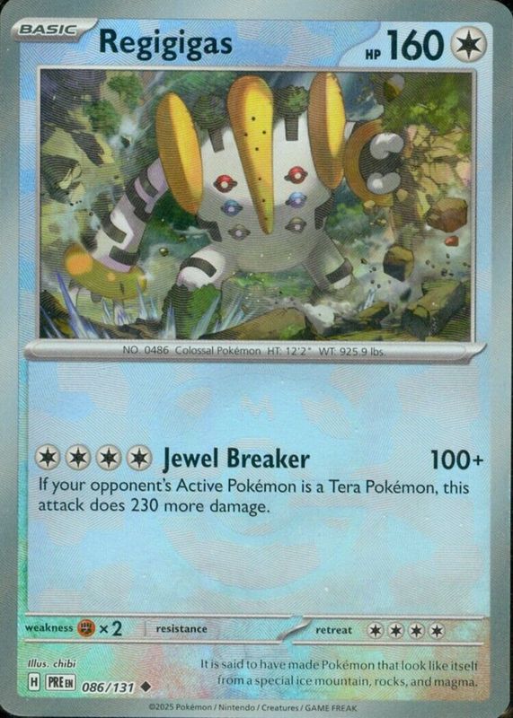 The Regigigas 2025 Scarlet & Violet: Prismatic Evolutions #086/131 Master Ball Reverse Holo card in Raw TCG (Lightly Played) condition has not changed in price in the last 30 days and was last sold for $1.00 .