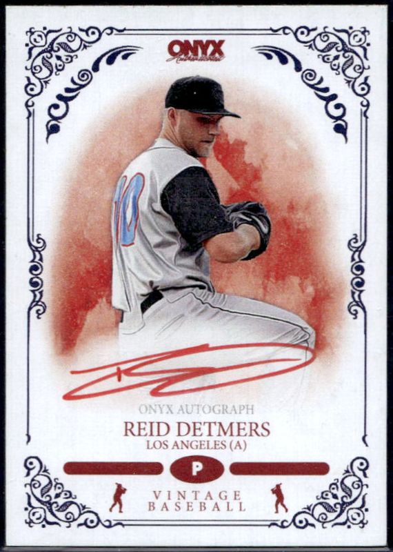 The Reid Detmers 2022 Onyx Vintage #VARD Autographs Red /25 Rookie card is 1 of 5 Reid Detmers' card variations in the 2022 Onyx Vintage set being tracked by Sports Card Investor, including Base, Autographs Blue, Autographs Green /50, and Autographs Black /5.