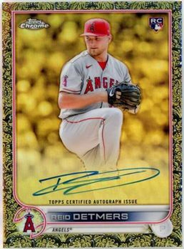 The Reid Detmers 2022 Topps Gilded Collection #GEA-RD Topps Chrome Gold Etch Autographs /99 Rookie card is 1 of 10 Reid Detmers' card variations in the 2022 Topps Gilded Collection set being tracked by Sports Card Investor, including Base /99, Mini-Diamond Gold Etch Refractor /50, RayWave Gold Etch Refractor /25, Lava Gold Etch Refractor /10, and Superfractor /1.